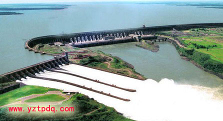 伊泰普水電站位于巴西與巴拉圭之間的界河——巴拉那河(世界第五大河,年徑流量7250億立方米)上,伊瓜蘇市北12公里處,是當(dāng)今世界裝機(jī)容量第二大,發(fā)電量最大的水電站。(裝機(jī)容量最大的是長江三峽水電站,總裝機(jī)容量將達(dá)到2250萬千瓦,年發(fā)電量為900億度左右。)由巴西與巴拉圭共建,發(fā)電機(jī)組和發(fā)電量由兩國均分。