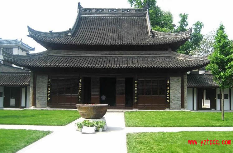 揚(yáng)州八怪紀(jì)念館由西方寺改建,八怪的代表人物金農(nóng)晚年即生活于寺中,以其故居為館,實(shí)在難得。西方寺建隋朝,原為避風(fēng)庵,面臨大江,據(jù)說唐代時(shí),寺前掘得三尊石佛,唐太宗敕賜“西方禪寺”,不久僧人智完遷建該寺于今址。兵燹戰(zhàn)火,屢廢屢修,所幸明代大殿巍然不動(dòng)。大殿構(gòu)架多為楠木制成,其梁架很有特色,柱頂做卷殺,成覆盆形式。梁架全部露明造,正中縫作抬梁形式,為月梁形制,山面為穿逗式。大殿內(nèi)彩繪在揚(yáng)州地區(qū)少見,因揚(yáng)州梁架都精于雕鏤,少施彩繪,但大殿內(nèi)卻遍施彩繪于梁架之上,甚至不用藻井,而以五彩遍裝,從僅存的小片彩繪分明看出,梁檁枋的彩繪為宋代風(fēng)格。而大片保存完好的則是明代早期彩繪風(fēng)格:構(gòu)圖鮮明,多用連枝圖案,花紋輪廓簡(jiǎn)單,色彩多用青綠及黃白互相襯托,表現(xiàn)花紋和底色。修復(fù)時(shí)采取了“以舊還舊”的古跡保護(hù)理論,盡量不損壞梁架造型及彩繪,使今人能窺見宋明的建筑藝術(shù)。王振世的《揚(yáng)州覽勝錄》載:“清乾隆中,仁和畫師金冬心先生游揚(yáng)州,嘗客寺中,后歿于世。”金農(nóng)晚年信佛,專事畫佛寫經(jīng),如今的金農(nóng)寄居室內(nèi)復(fù)原了他的起居繪畫的陳設(shè)。他在寺中曾題詩壁上:“無佛又無僧,空堂一盞燈。杯貪京口酒,書殺剡中藤。占?jí)艚穸紤?yīng),諛人老未能。此處何所想?池上鶴窺冰。”看來當(dāng)時(shí)境況甚為凄涼,畫家孤燈獨(dú)臥,形只影單,但可敬者“諛人老未能”,決不趨炎附勢(shì),寧可“池上鶴窺冰”,保持清雅和高潔,以其人品藝品方面贏得人們的緬懷??梢愿嫖肯壬氖?,如今他的故居已成紀(jì)念他們的地方——八怪的紀(jì)念館,其中八怪的身平業(yè)績(jī),飄香的翰墨都使后人瞻仰到八怪的赫赫風(fēng)采。