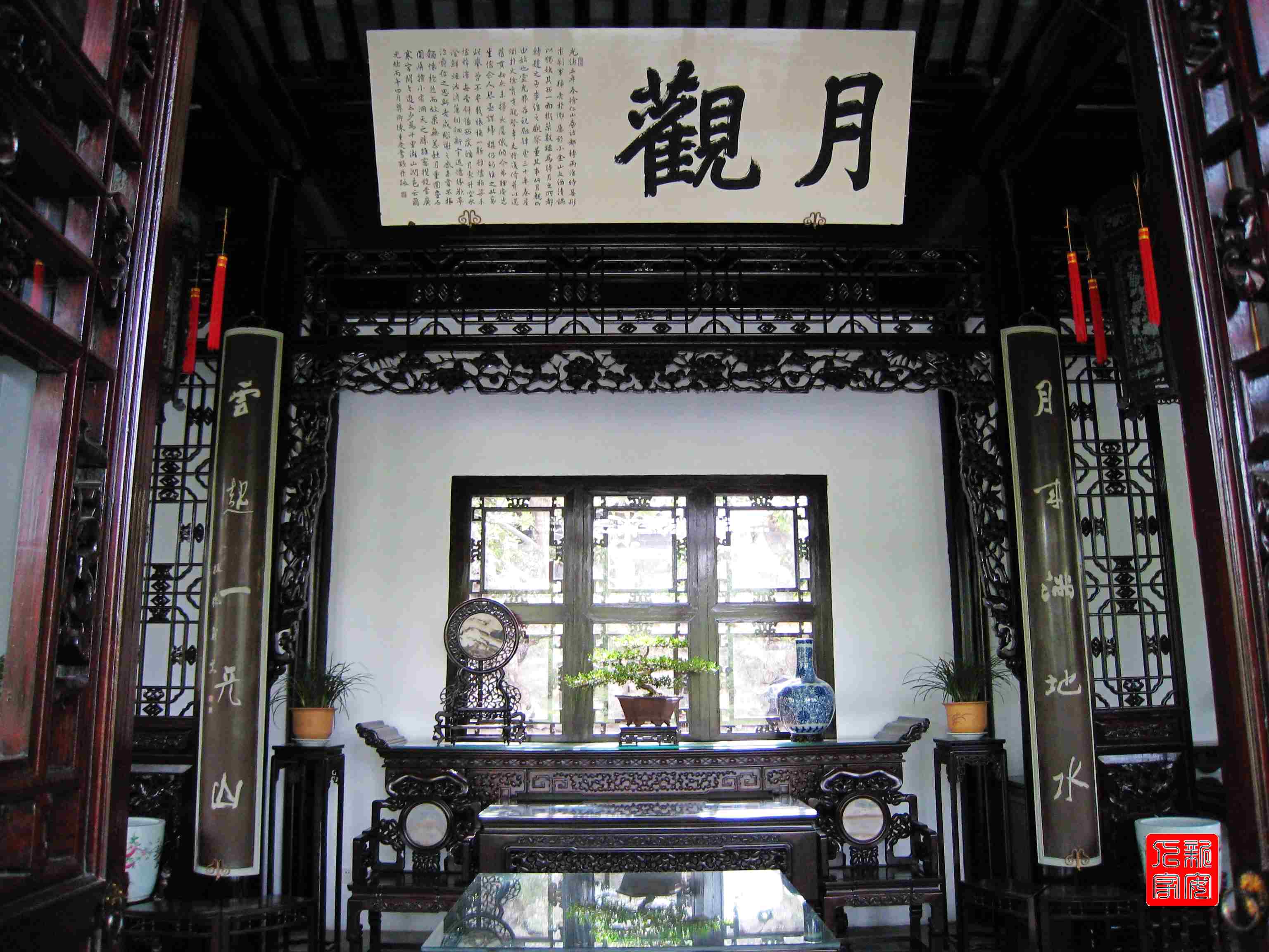 月觀中的海梅家具也很有特點(diǎn),雕刻的內(nèi)容都和賞月有關(guān)。那些蓮花、鴛鴦、荷葉,藕節(jié),無(wú)不自然生動(dòng),是揚(yáng)州木雕工藝的代表作品。