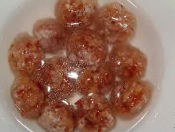 做藕粉圓子首先是制作圓子餡。將花生仁、芝麻仁、核桃仁炒熟焙干分別碾成細(xì)末。將紅棗或大棗煮爛去皮,加糖熬成糖泥后,分別與上述三種仁末同拌,做成小丸,成花生、芝麻、核桃餡料丸。將干藕粉散放在竹匾內(nèi),取丸餡在匾中滾動,粘上藕粉,取出,噴灑上微水,再入藕粉匾中滾過,再取出,再噴水,再滾過,直至藕粉圓子坯大小適當(dāng)為好。也有人將圓子生坯沸水內(nèi)一過,再入匾中滾藕粉增大。后者方法做圓子雖快,但圓子表面粗糙,大小也難以一致。做藕粉圓子的高手所做出的藕粉圓子看上去大小一樣,表面光滑,賞心悅目。吃到口里是軟、綿、糯、香。下藕粉圓子并不復(fù)雜,和下普通圓子基本相似。鍋內(nèi)藕粉圓子在沸湯中浮起后,再加入一點冷水,再待湯沸鍋中的圓子全部上浮,呈半透明狀,圓子起暗紅色,即可用漏勺撈出盛到配有桂花糖鹵的碗中上席。
